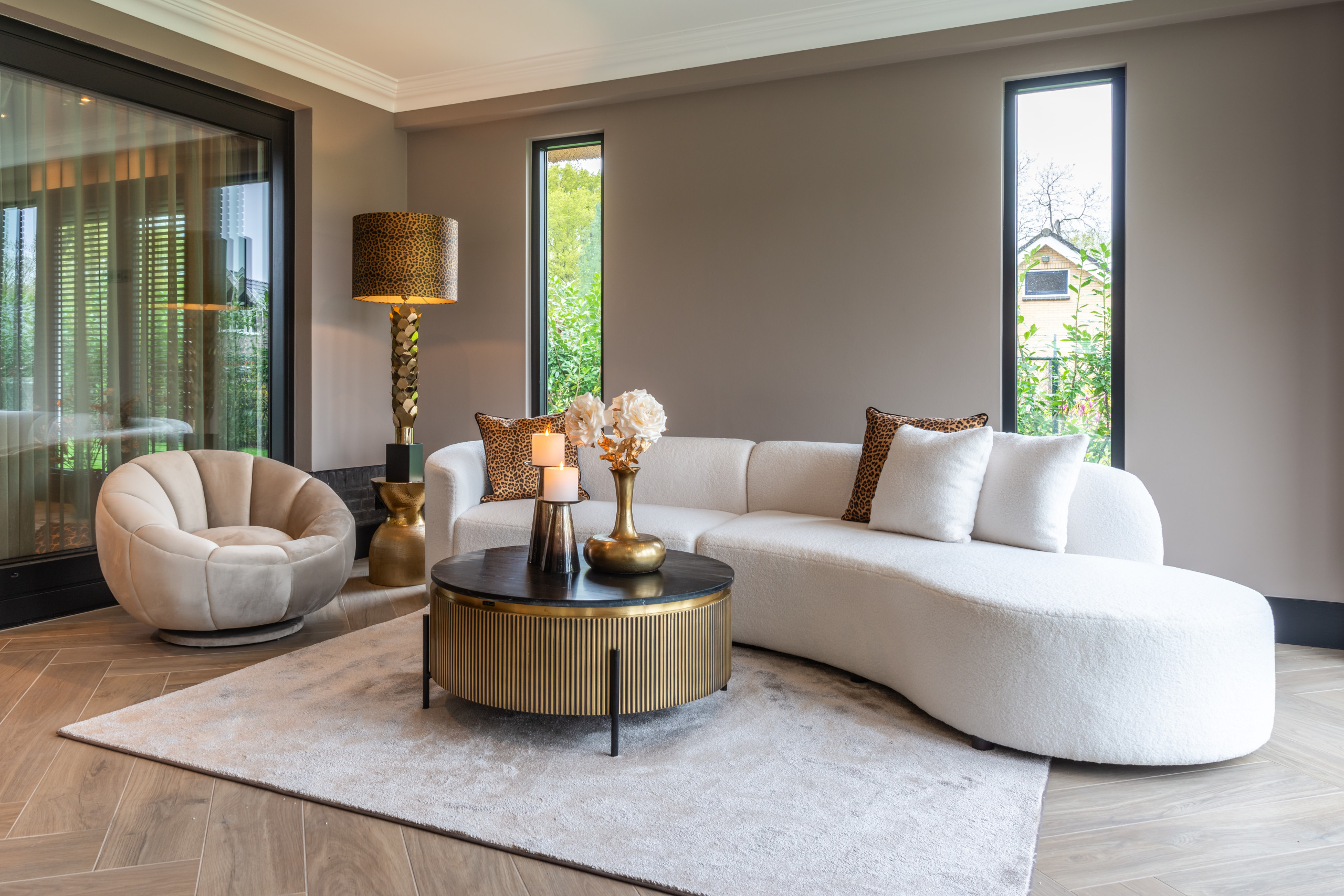 Fauteuil Jezebel straalt luxe uit met zijn ronde vorm en weelderige cream fancy-stof. Wordt geleverd met één los kussen voor extra comfort.