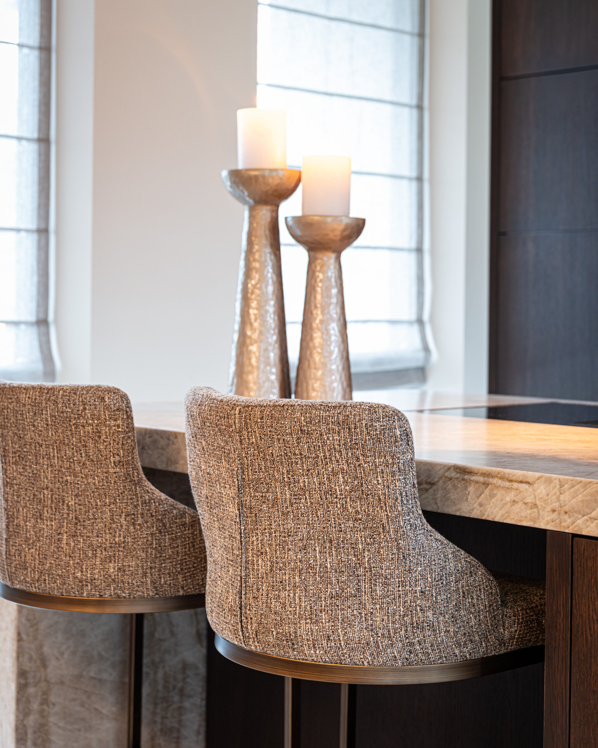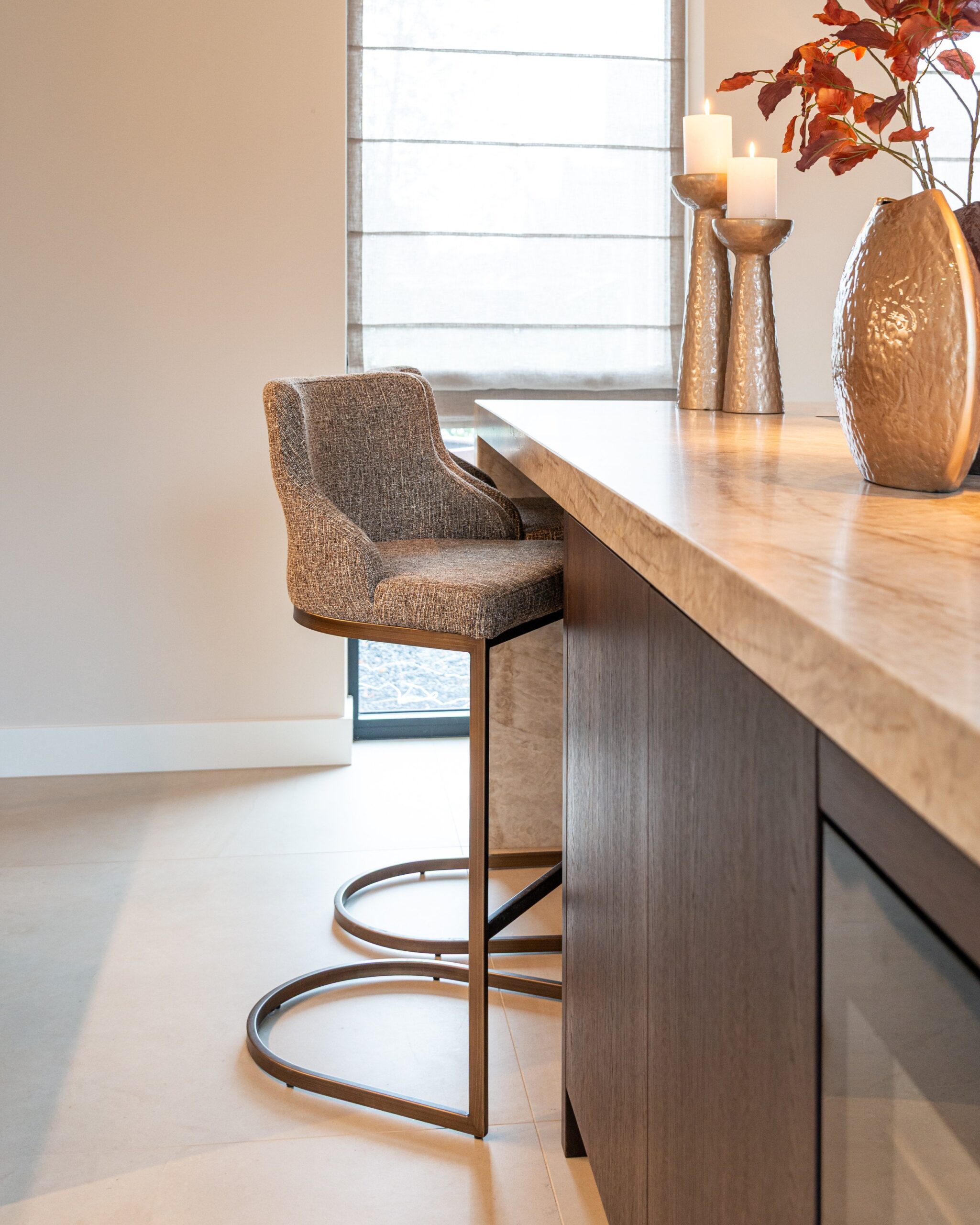 Barkruk Bolton heeft hetzelfde slanke silhouet, nu in brown tweed. Een tijdloze barkruk die goed combineert met natuurlijke materialen. Set van twee.