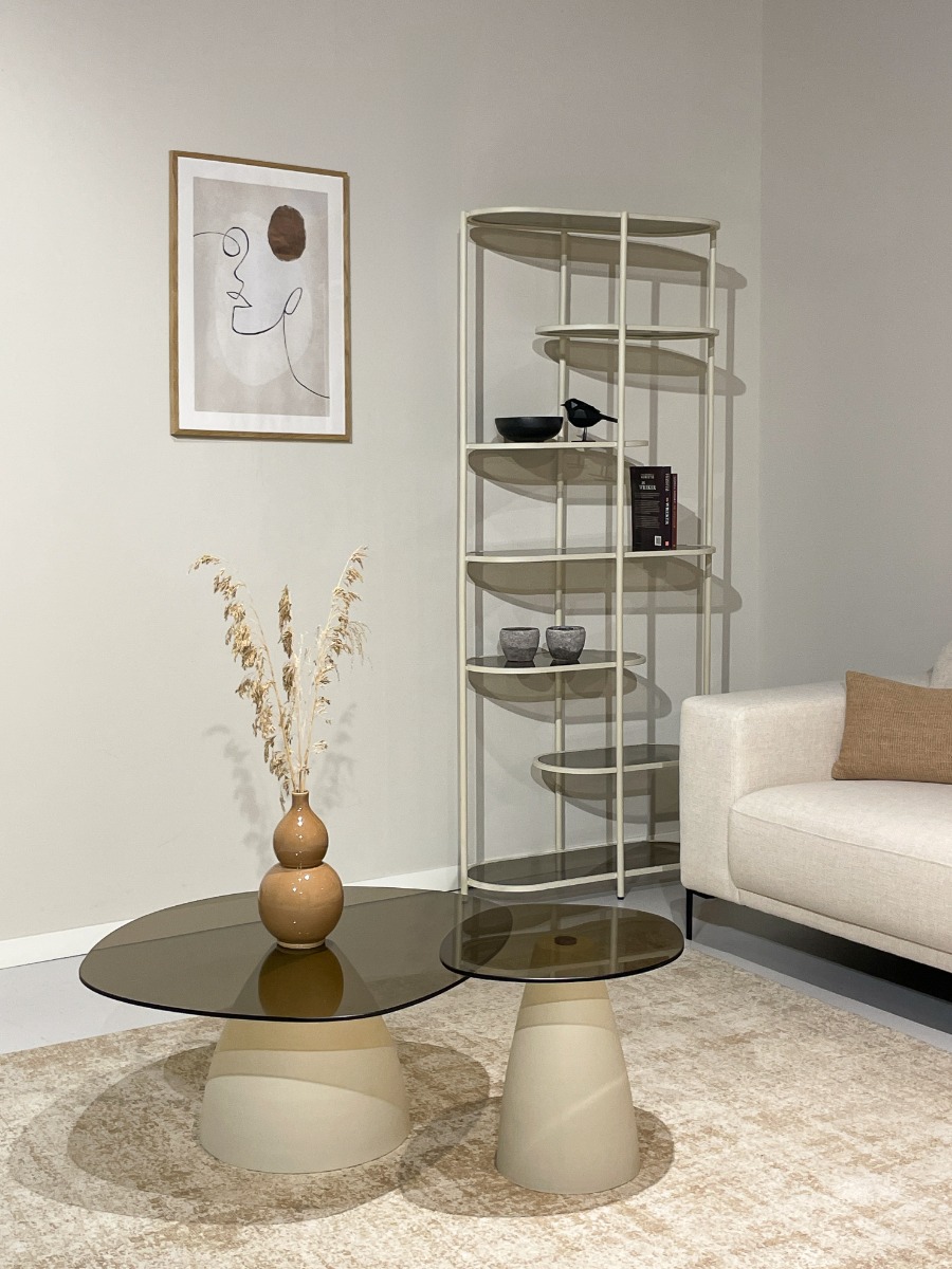 Geef je interieur een stijlvolle upgrade met wandrek Jill, gemaakt van hoogwaardig gecoat staal in combinatie met luxe rookglas. De organische vormen en open structuur maken dit ontwerp een echte eyecatcher in elke ruimte. Perfect om je mooiste accessoires, planten of boeken te presenteren. Jill biedt een ideale mix van functionaliteit en modern design.