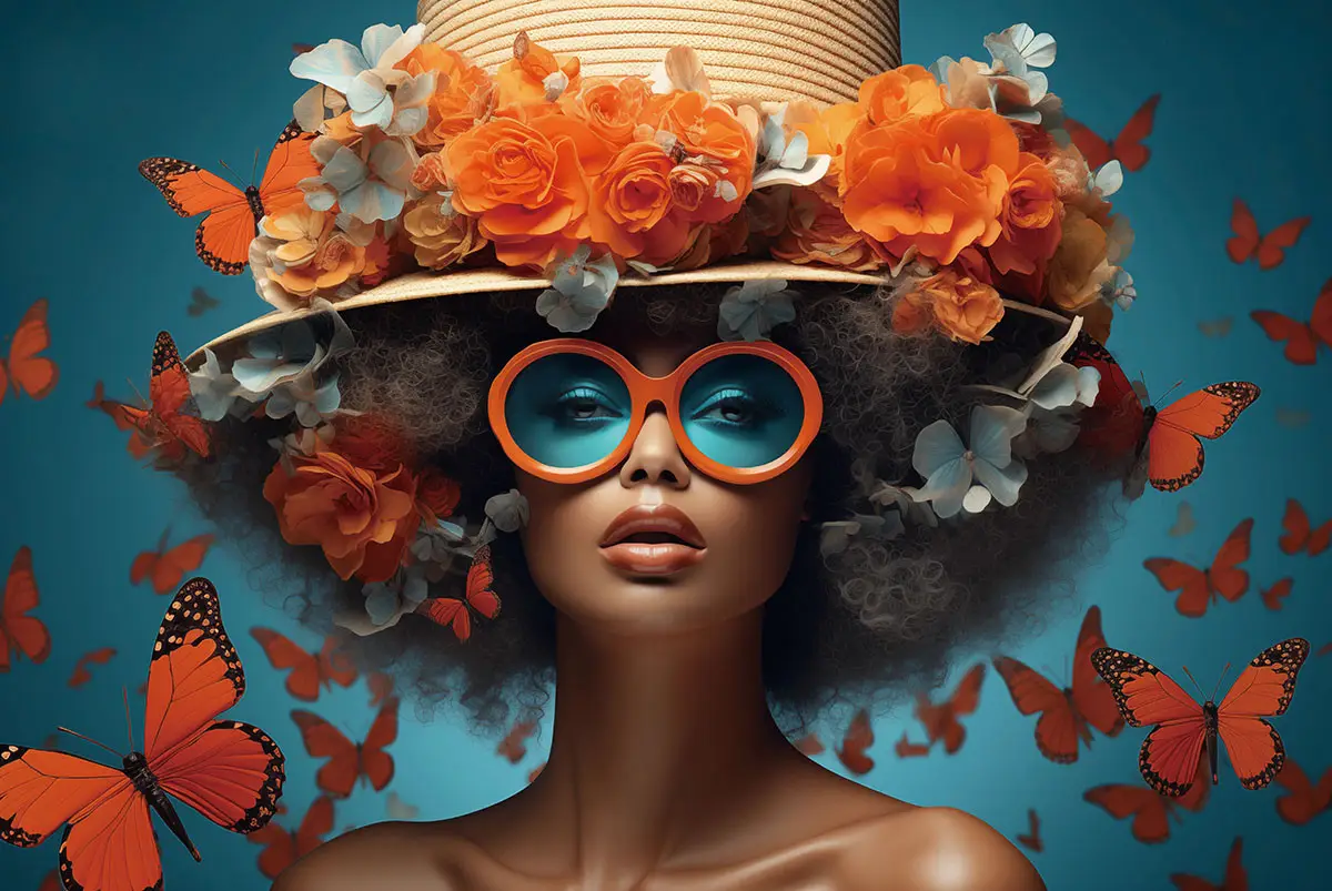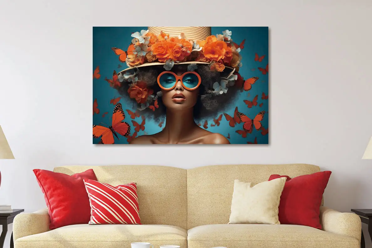 Glasschilderij 120x80cm Vrouw met hoed en oranje bloemen
