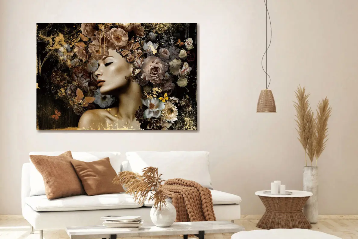 Glasschilderij 160x110cm Vrouw in goud met bloemen