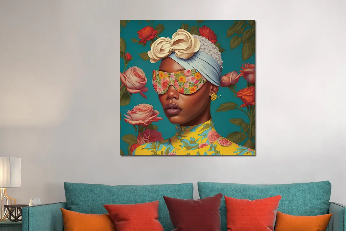 Glasschilderij 80x80cm Vrouw met gekleurde bril